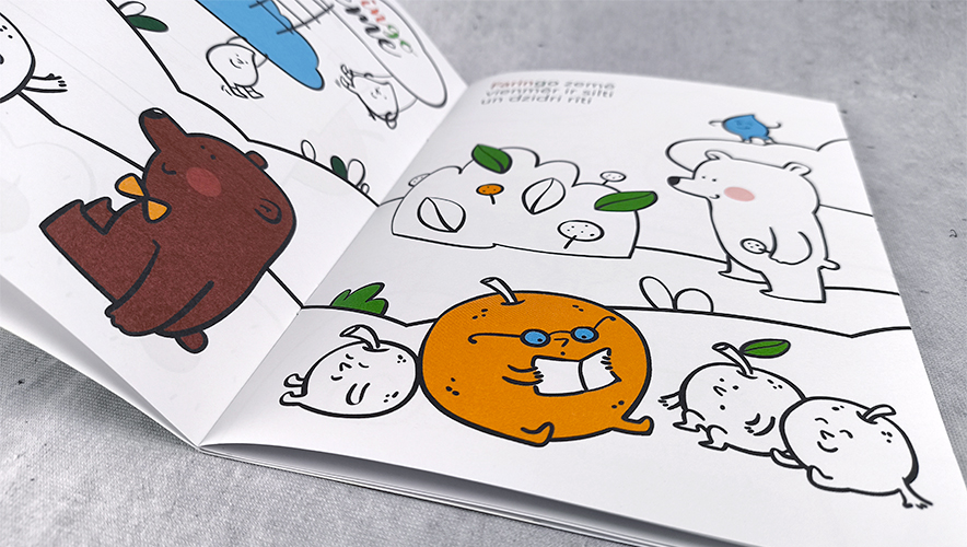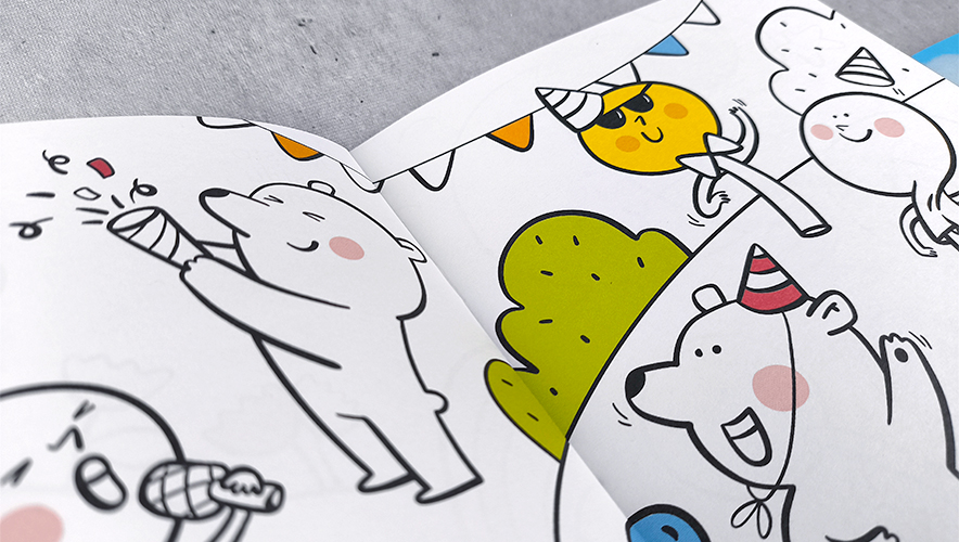 enivo klientam izstrādāja krāsojamās grāmatas – gan sazīmēja pašas ilustrācijas balstoties uz klienta stāstu, gan samaketēja un sagatavoja failu drukai.